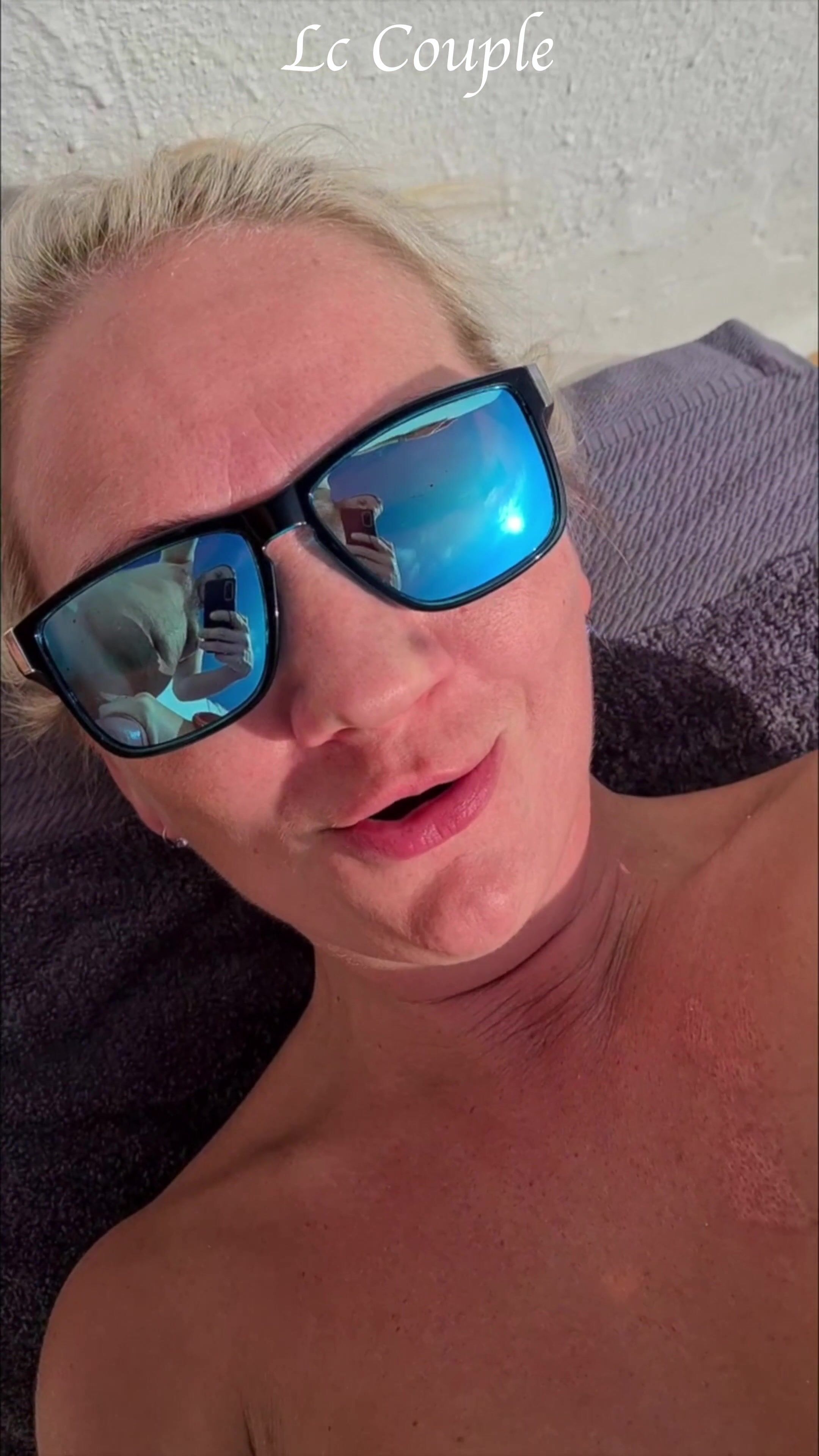 . She said, that she is just taking sun, but reality was, that she took her toy with her and she just went to play with her shaved pussy until moaning orgasm. Husband of course had first row view with his phone camera. Enjoy!