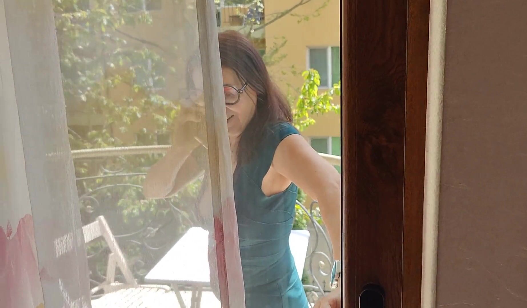 . Stepmom in sexy black stockings went out to the balcony to talk to her lover, and her stepson locked her there! A short dialogue, she went out and he fucked her in her fat thighs! What a slut...
